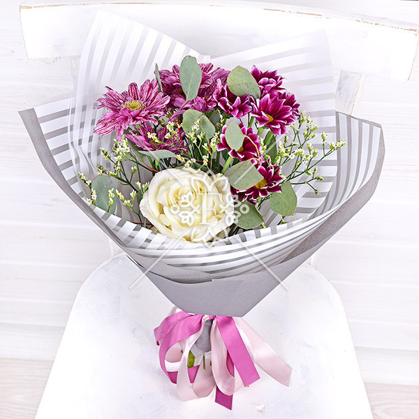 Роза белая – 1 шт., хризантема сиреневая/фиолетовая– 1 шт., зелень декоративная (лимониум белый и эвкалипт – 2 шт.), упаковка, лента.
