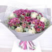 По-королевски изящные белые розы дарят свой чарующий аромат и гармонию, передают Ваши искренние пожелания и чувства, прекрасно сочетаясь с изумительно нежными хризантемами фиолетового оттенка! Букет выглядит идеально и привлекательно!
