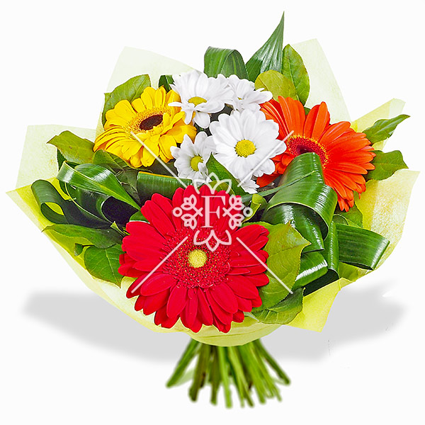 Микс гербер ярких оттенков, разбавленных нежностью белых хризантем, дополненных зеленью, будет радовать своей красотой длительное время.